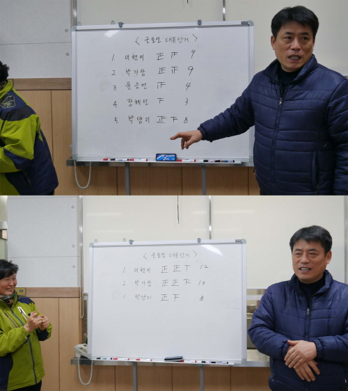 근로인 대표는 첫번째 개표에서 동률이 나와서 재투표 후 1표차이로 박*람 님께서 재선임 되었습니다.